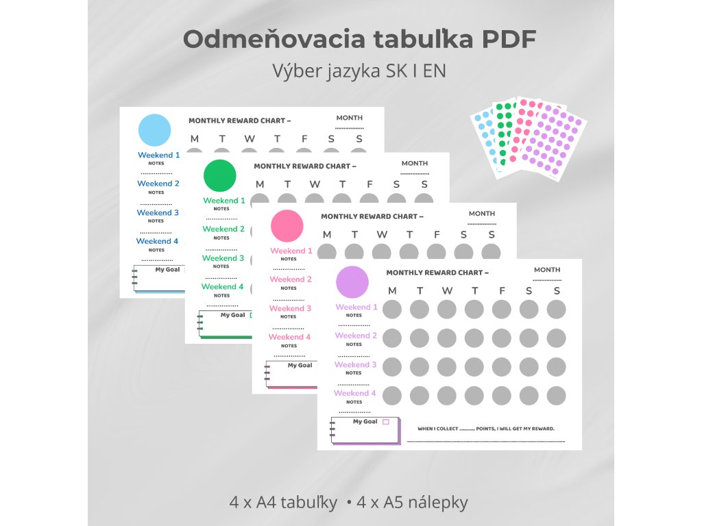 Mesačná odmeňovacia tabuľka pre deti – PDF + samolepky (4 farby)